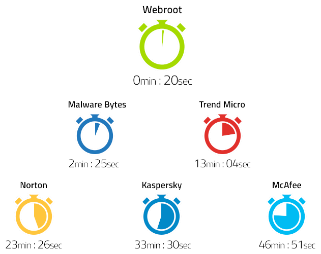 Webroot takes 20 seconds to check your computer for malicious malware - 60x faster than the average scan time tested competitor antivirus products.